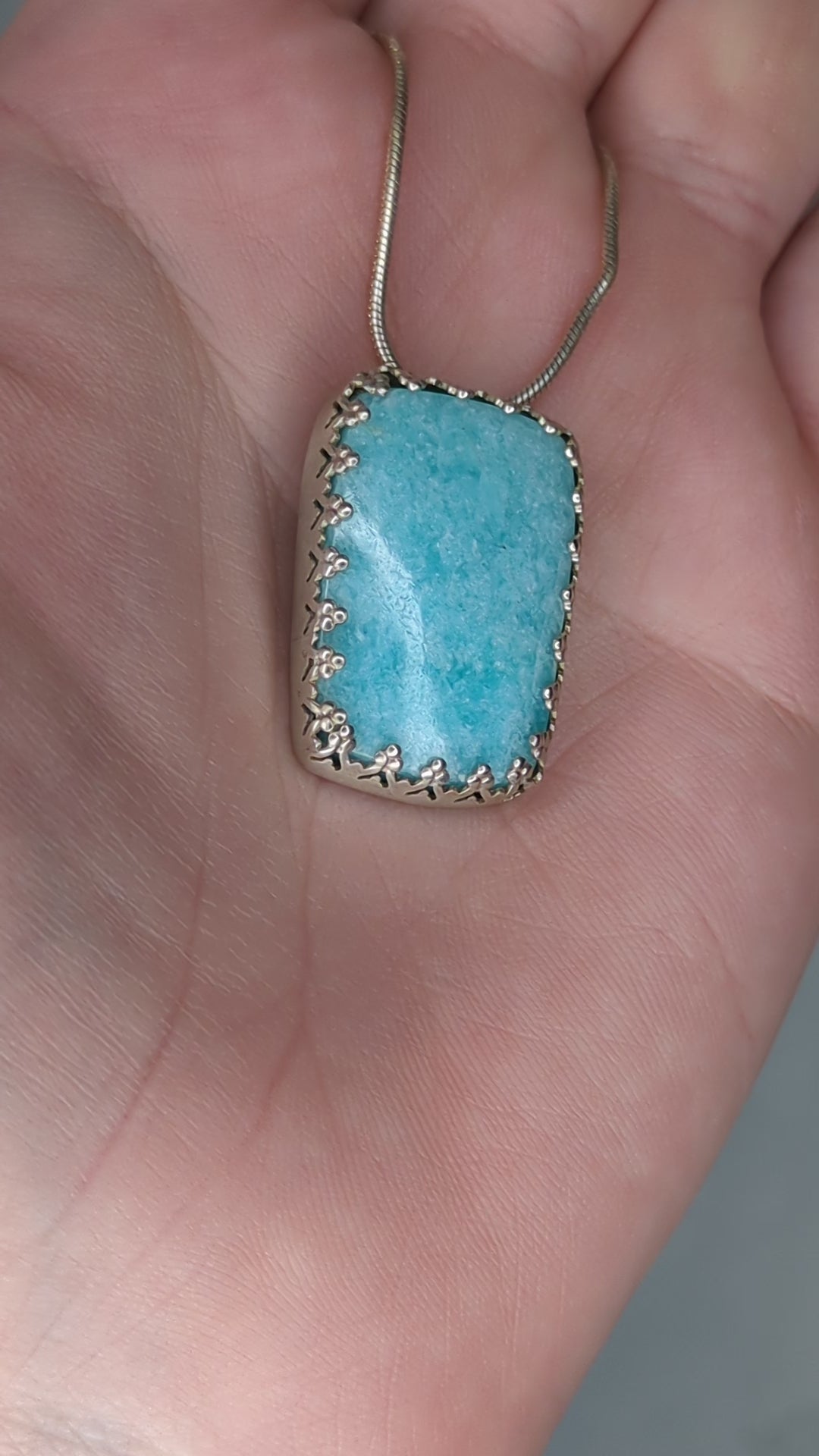 This beautiful necklace is handmade from hypoallergenic sterling silver and features a natural amazonite gemstone. The pendant is about 1/2" x 1" and comes with an 18" sterling silver necklace chain. The back is stamped with a small Buffalo Moon Designs maker's mark.