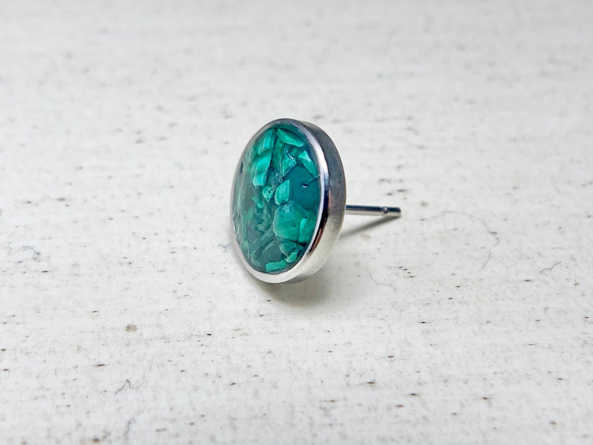 Handmade from stainless steel, these stud earrings are hypoallergenic and as sturdy as titanium. Raw malachite pieces are placed with love and attention to detail in each set of earrings. They're 10mm in diameter and come with silicone earring backs.