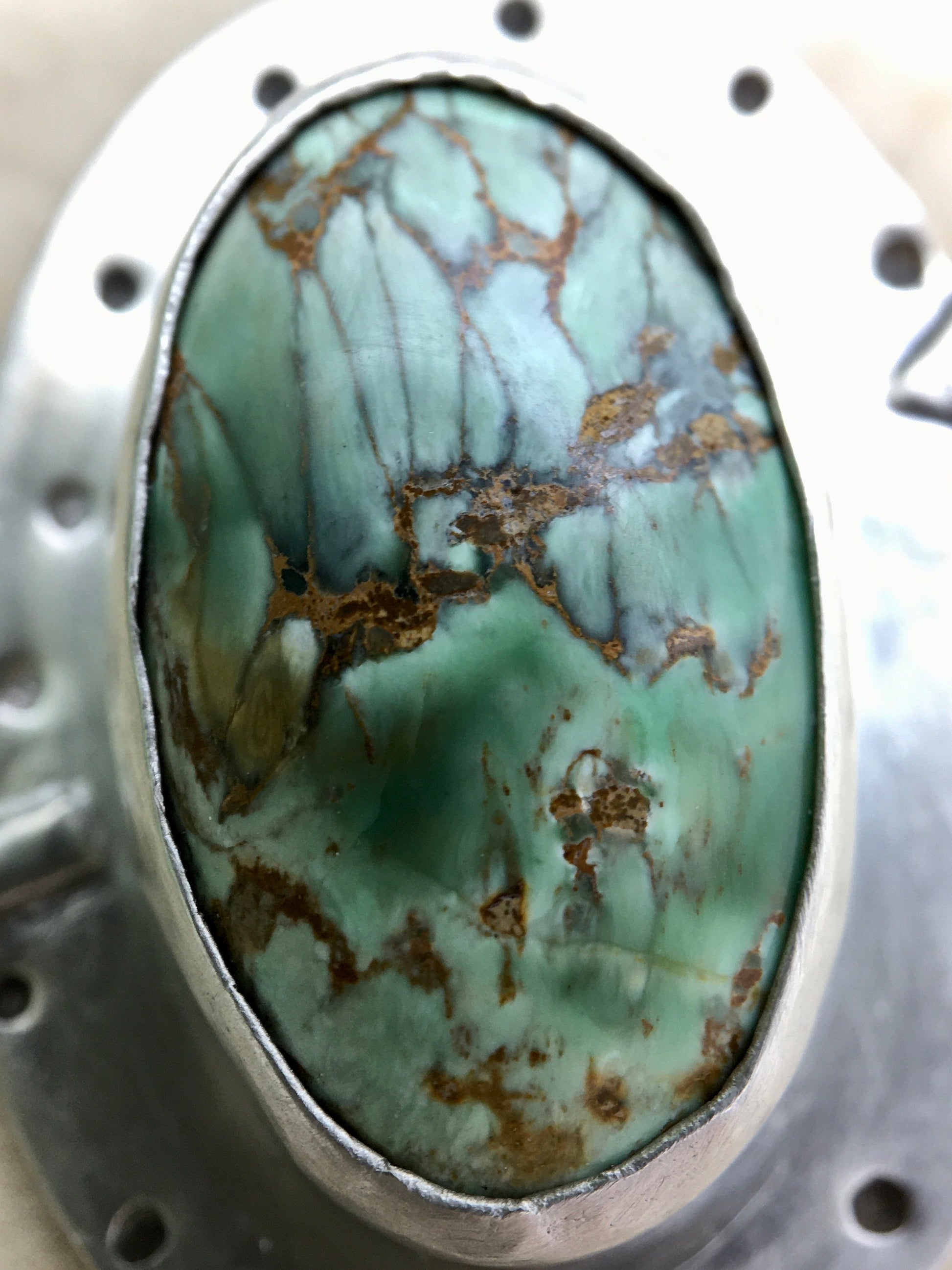 This striking necklace is handmade with sterling silver and Australian variscite. Its unique and eye-catching border and arrow accents are sure to turn heads. The pendant is about 1" by 1 2/8" and comes with an 18" silver necklace chain. The back is stamped with a small Buffalo Moon Designs maker's mark.